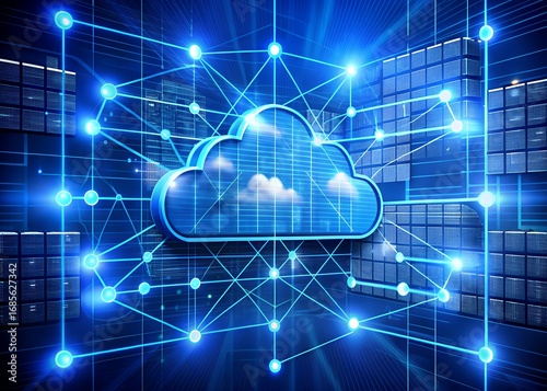 The watermark will not be included on Wall mural.: Digital cloud computing network connection with glowing blue lines and nodes in a futuristic data ce