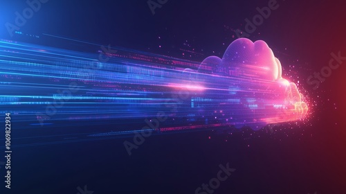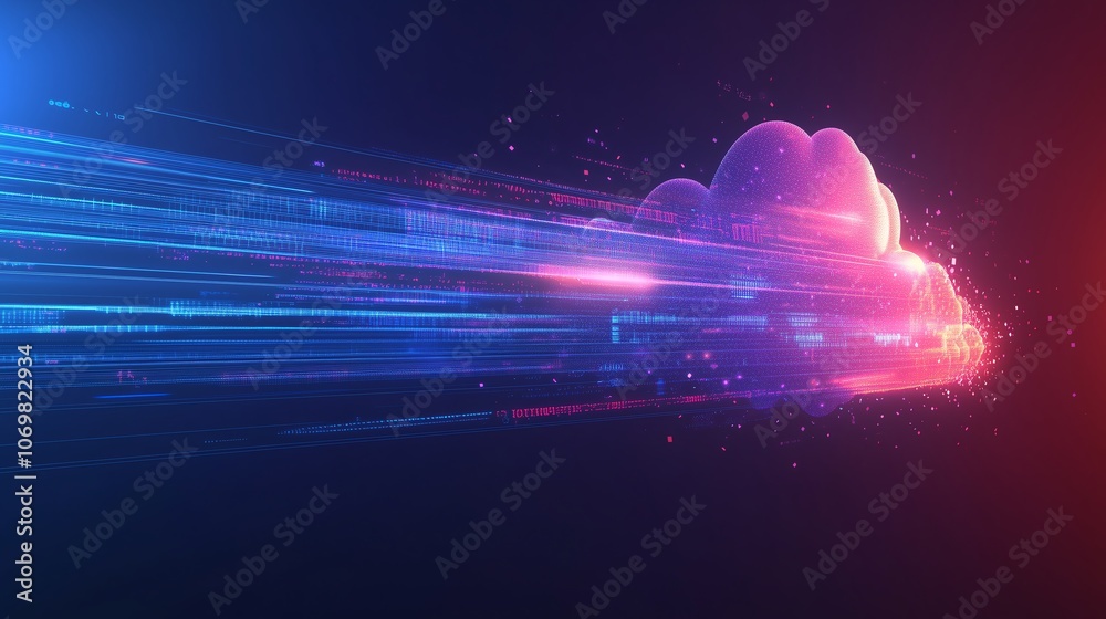 Wall mural : Digital cloud computing technology concept with binary code, low poly wireframe, and glowing particl