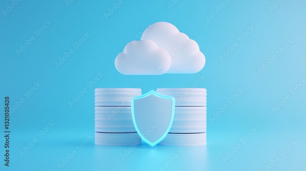 The watermark will not be included on Wall mural.: Digital cloud storage concept with cloud and shield symbolizing data security in vibrant blue backgr