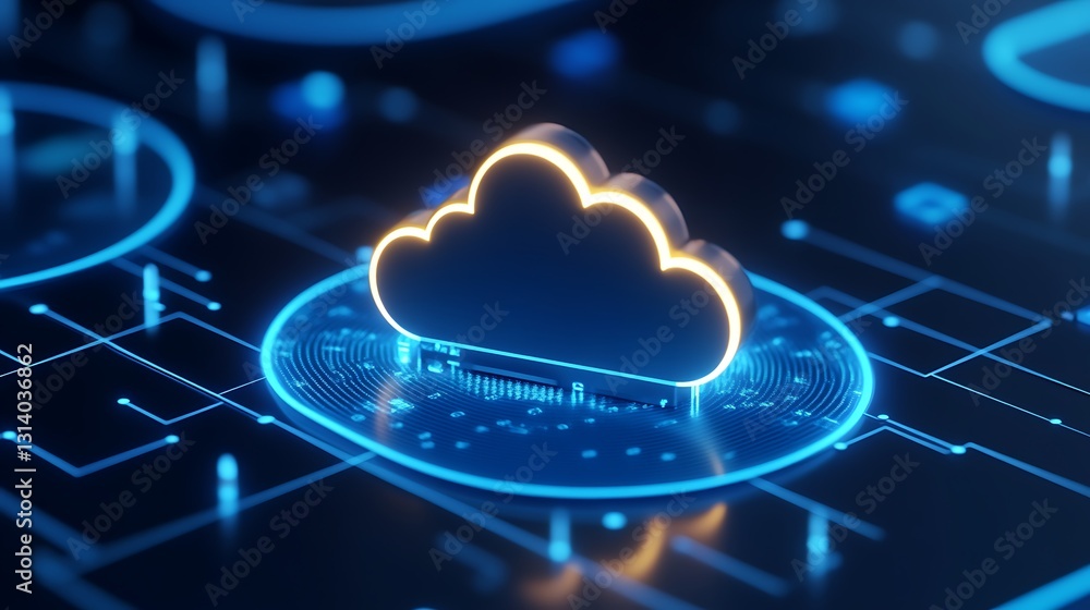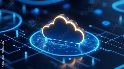Wall mural : Digital cloud technology icon with glowing edges on a futuristic data interface background in blue t