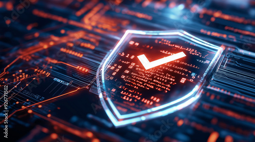 Wall mural digital code flowing around a rustic shield with a glowing checkmark, symbolizing rust's commitment  - Wall murals Wall mural digital code flowing around a rustic shield with a glowing checkmark, symbolizing rust's commitment - Wall murals