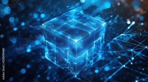 The watermark will not be included on Wall mural.: Digital cube surrounded by glowing blue particles in abstract space