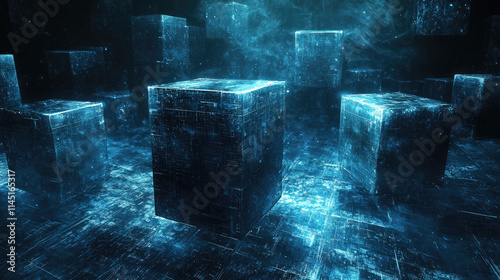 Wall mural digital cubes in dark cyberspace, futuristic data blocks with cyber energy like tech innovation, abs