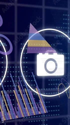 The watermark will not be included on Wall mural.: Digital data processing animation over icons of camera, computer, and bar graphs