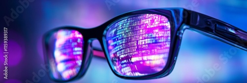 Wall mural : Digital data reflection in glasses - futuristic eyewear reflecting binary code, symbolizing technolo