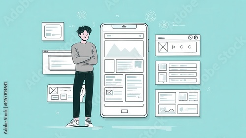 Wall mural : Digital design workflow illustrated with a person and mobile interface elements -