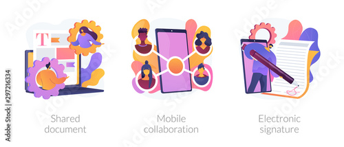 Wall mural : Digital documentation, remote colleagues connection, contract signing icons set - shared document, mo