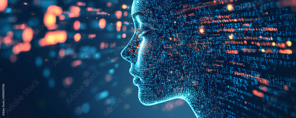 Wall mural : Digital face silhouette with binary code flowing, representing technology and data - vibrant colors a