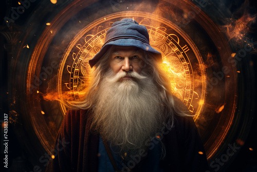 The watermark will not be included on Wall mural.: Digital generative ai collage image of wise wizard doing burning ritual spell