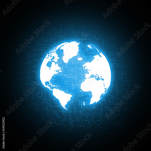 Wall mural digital globalization. holographic map of the world against the background of technical schemes.