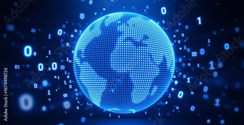 Wall mural digital globe formed by glowing blue dots surrounded by binary code, representing global data and te - Wall murals Wall mural digital globe formed by glowing blue dots surrounded by binary code, representing global data and te - Wall murals