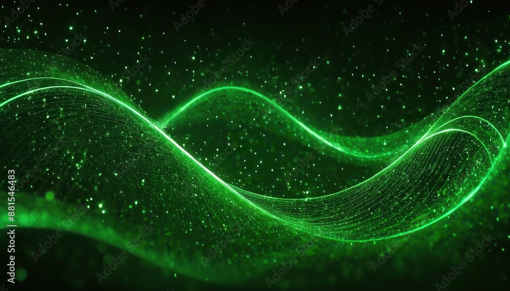 Wall mural : Digital green particles wave and light abstract background with shining dots and stars - abstract wal