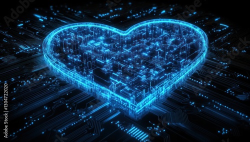 The watermark will not be included on Wall mural.: Digital heart circuitry glowing with intricate blue interconnected lines signifying connection
