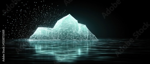The watermark will not be included on Wall mural.: Digital iceberg floating on dark water surface with glowing particles and network connections in a f