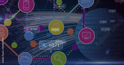 The watermark will not be included on Wall mural.: Digital icons representing technology, data floating across dark starry background
