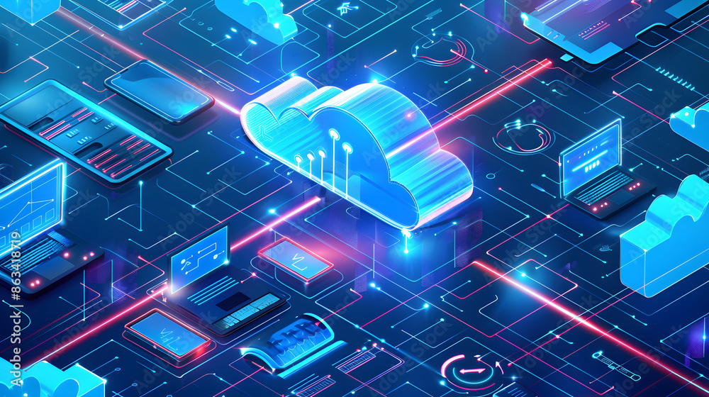 Wall mural digital illustration cloud computing concept data management storage process interconnection devices - Wall murals Wall mural digital illustration cloud computing concept data management storage process interconnection devices - Wall murals