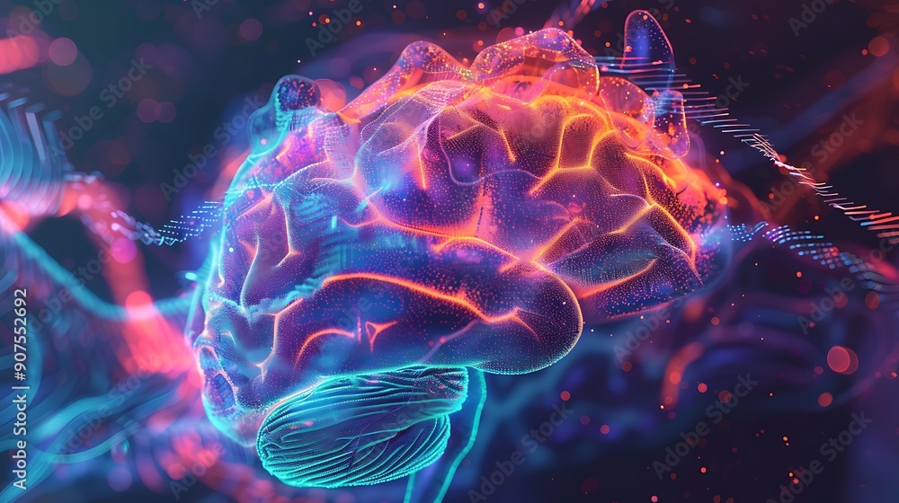 Wall mural digital illustration of a brain with neon lights and glowing particles. it is an abstract representa - Wall murals Wall mural digital illustration of a brain with neon lights and glowing particles. it is an abstract representa - Wall murals