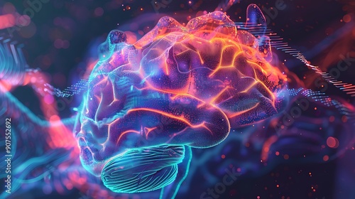 Wall mural digital illustration of a brain with neon lights and glowing particles. it is an abstract representa