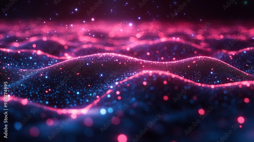 The watermark will not be included on Wall mural.: Digital illustration of abstract wave pattern made of particles with gradient from blue to pink and
