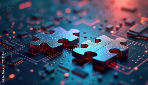 Digital illustration shows two interlocking puzzle pieces on futuristic circuit board - integration, Wall mural
