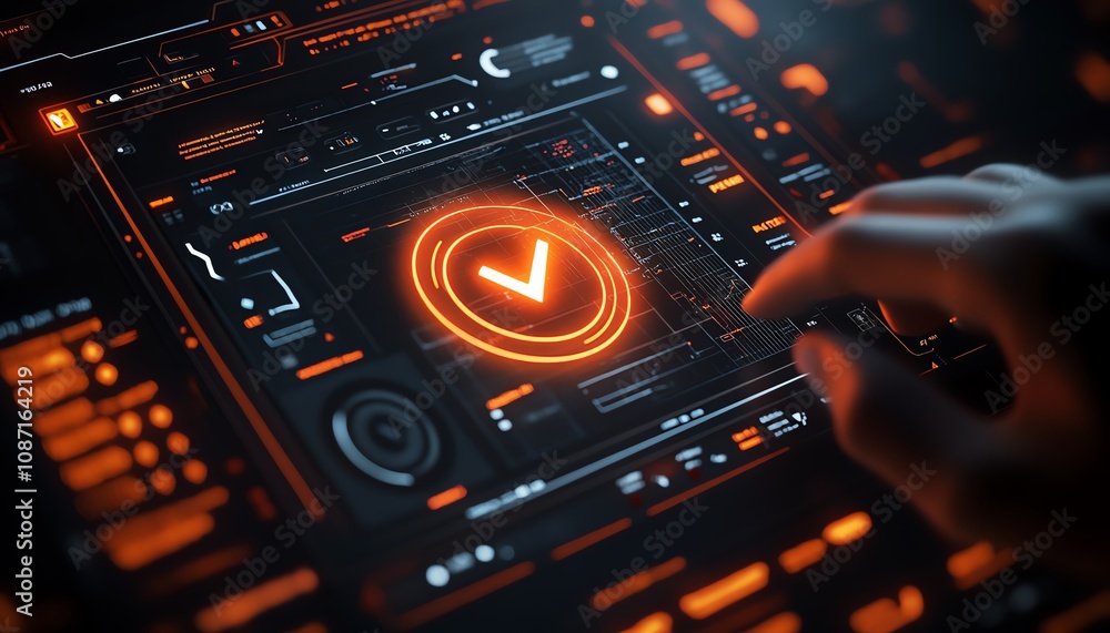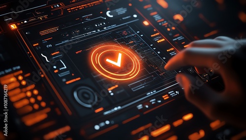 Wall mural digital interface with a person interacting, glowing checkbox highlighted, dark background, symboliz - Wall murals Wall mural digital interface with a person interacting, glowing checkbox highlighted, dark background, symboliz - Wall murals