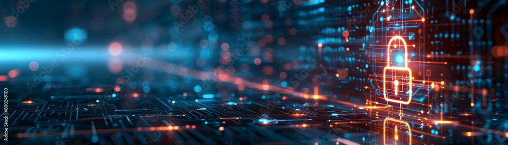Wall mural : Digital lock symbol, cybersecurity system, and data encryption technology displayed on a virtual int