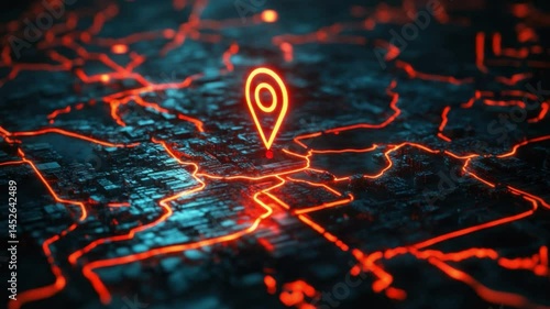 Wall mural : Digital map with neon location pin highlighting specific area on futuristic background
