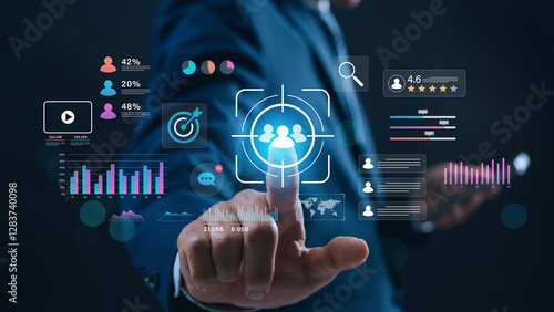 Wall mural : Digital marketing strategy and audience targeting concept - businessman interacts with data analytics