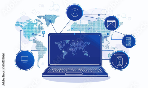Wall mural digital networking and technology concept with laptop and world map vector illustration