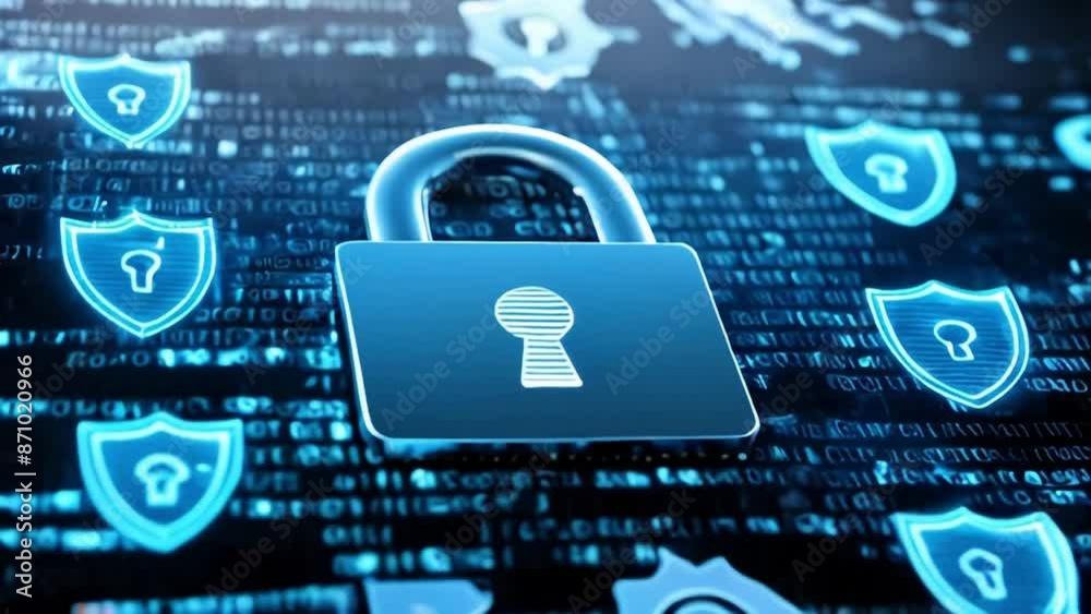 Digital padlock symbol on computer screen glowing blue icons binary code cyber securityWall mural
