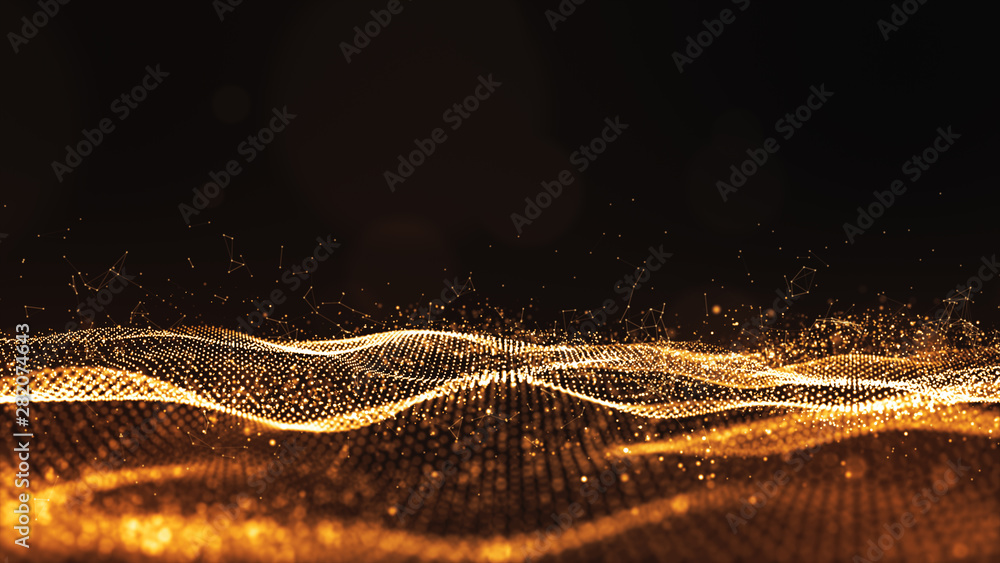 Wall mural digital particles gold color wave flow abstract background