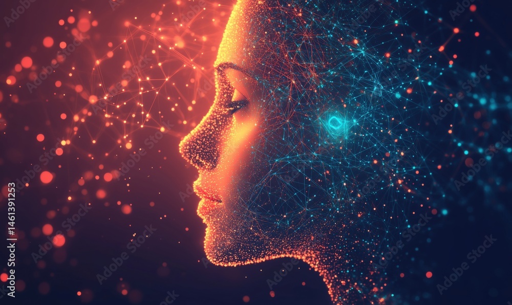 Wall mural : Digital portrait of a woman with glowing network connections and abstract patterns