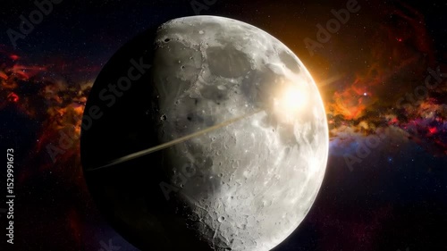 The watermark will not be included on Wall mural.: Digital rendering of a moonscape with planetary ring in front of a colorful nebula and distant stars