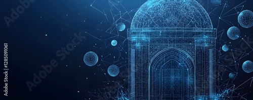 The watermark will not be included on Wall mural.: Digital representation of a building with geometric lines and spheres