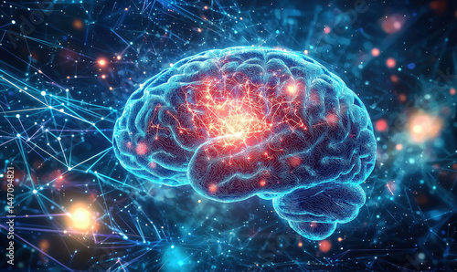 Wall mural digital representation of a human brain with neural connections and glowing synapses. - Wall murals Wall mural digital representation of a human brain with neural connections and glowing synapses. - Wall murals