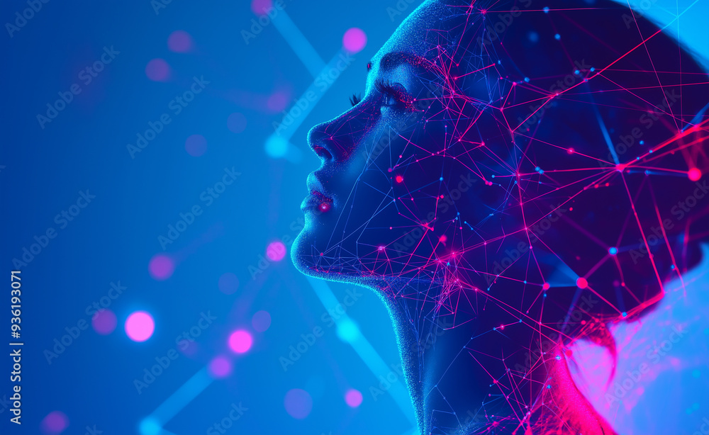 The watermark will not be included on Wall mural.: Digital representation of a human profile with glowing connections and data -