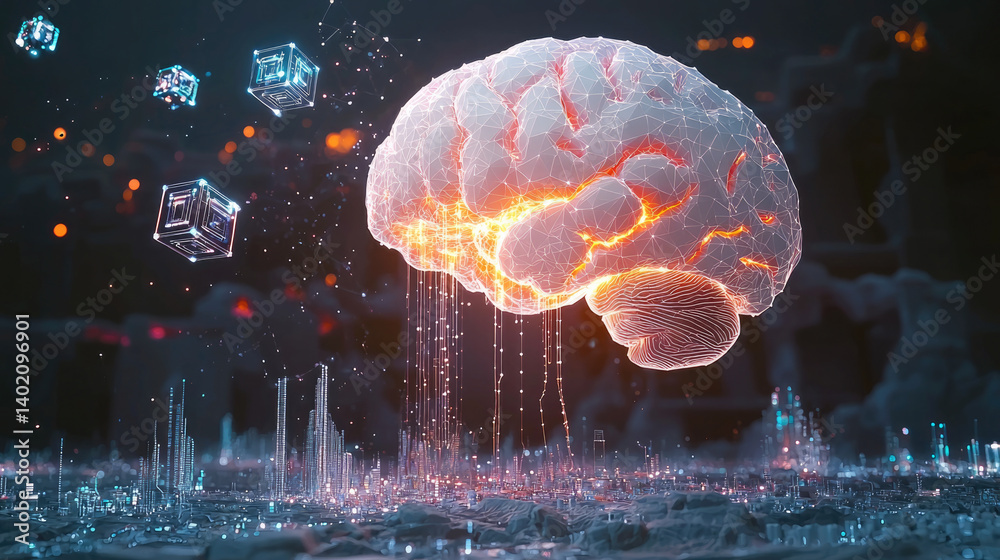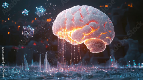 The watermark will not be included on Wall mural.: Digital representation of brain with glowing neural connections, surrounded by floating geometric sh
