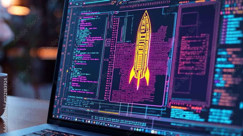 Digital rocket launch interface on computer screen with code, technology startup and innovation concWall mural