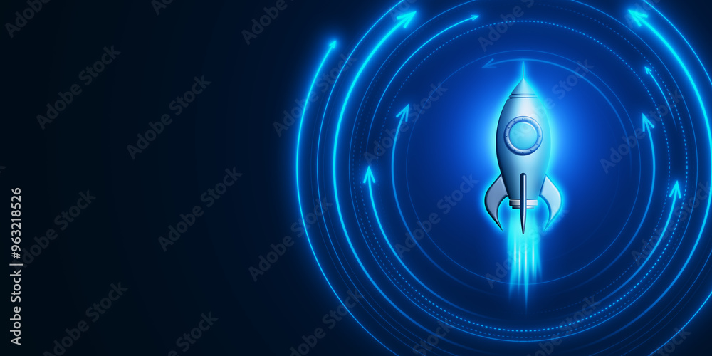 Wall mural digital rocket launch with blue neon background. 3d rendering