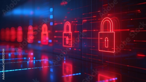 Wall mural digital security concept with glowing red padlocks and data flow background, representing network pr - Wall murals Wall mural digital security concept with glowing red padlocks and data flow background, representing network pr - Wall murals
