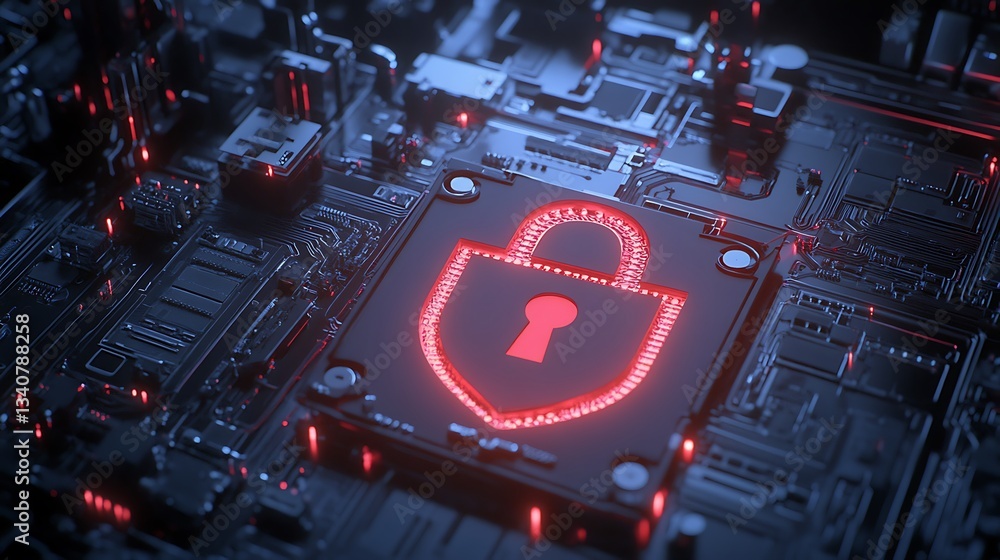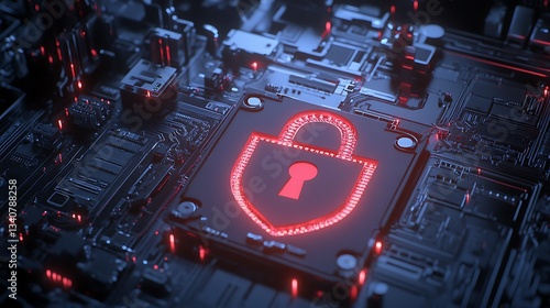 Digital security concept with lock icon on circuit board in neon red and black color schemeWall mural