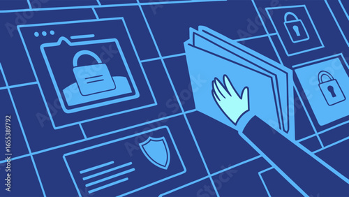Wall mural digital security system with hand and padlocks on a grid. - Wall murals Wall mural digital security system with hand and padlocks on a grid. - Wall murals