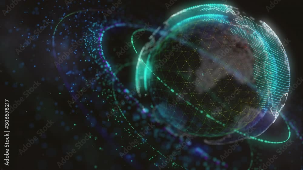 Wall mural digital shinny globe of earth. rotation of glossy planet with glowing particles. 3d animation of spa