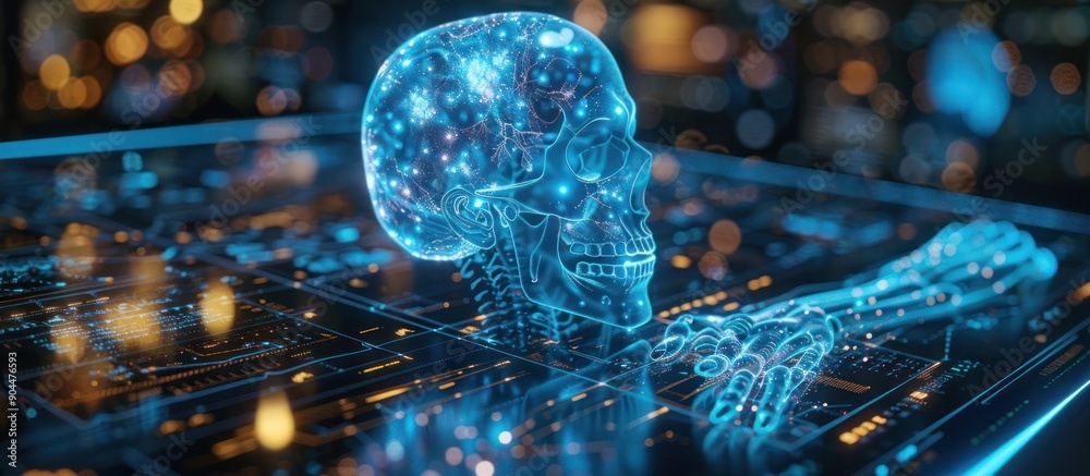 The watermark will not be included on Wall mural.: Digital skeleton interacting with a futuristic interface