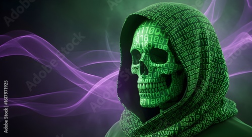 Wall mural : Digital skull with computer code pattern on a dark background represents data privacy, cyber securit