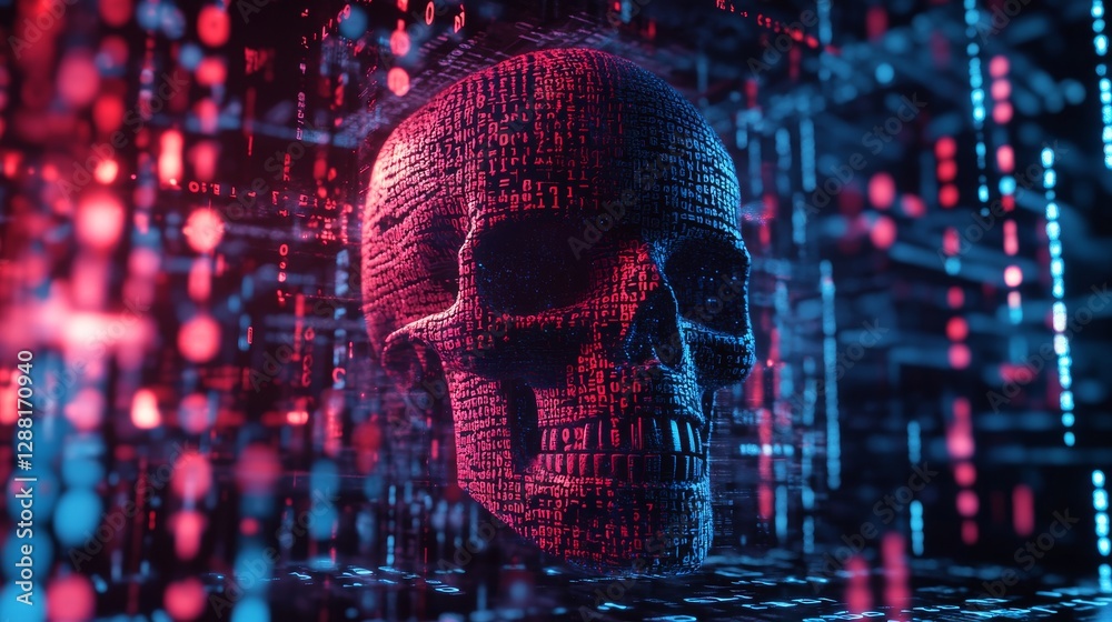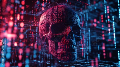 Wall mural digital skull with red coding on dark background, illuminated in blue and red lights. cybersecurity