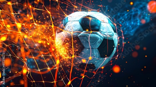 Wall mural : Digital soccer ball in a dynamic network of energy lines on dark background, ideal for modern sports