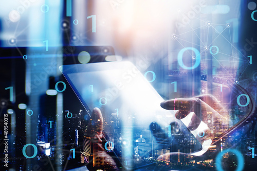 Wall mural digital software technology development and big data concept, man programmer using digital tablet an - Wall murals Wall mural digital software technology development and big data concept, man programmer using digital tablet an - Wall murals