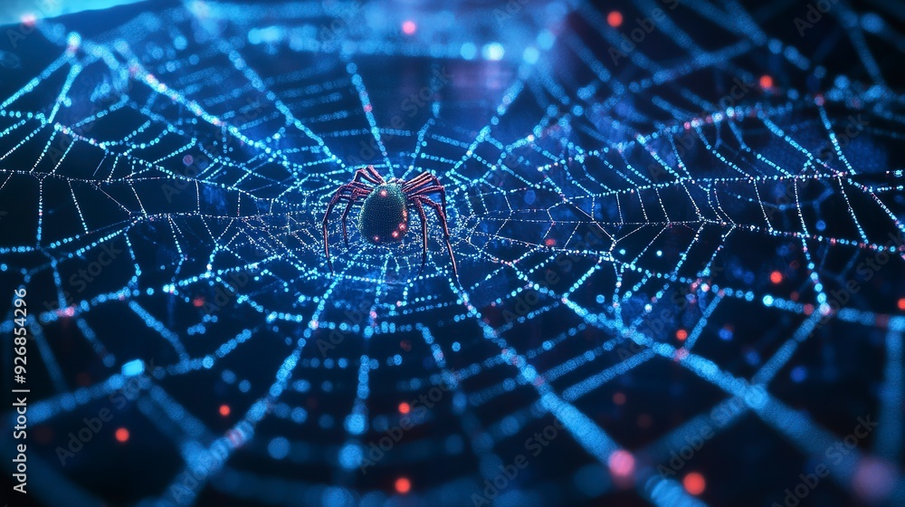 Wall mural digital spider web with cyber microchip spiders on a data mesh. - Wall murals Wall mural digital spider web with cyber microchip spiders on a data mesh. - Wall murals