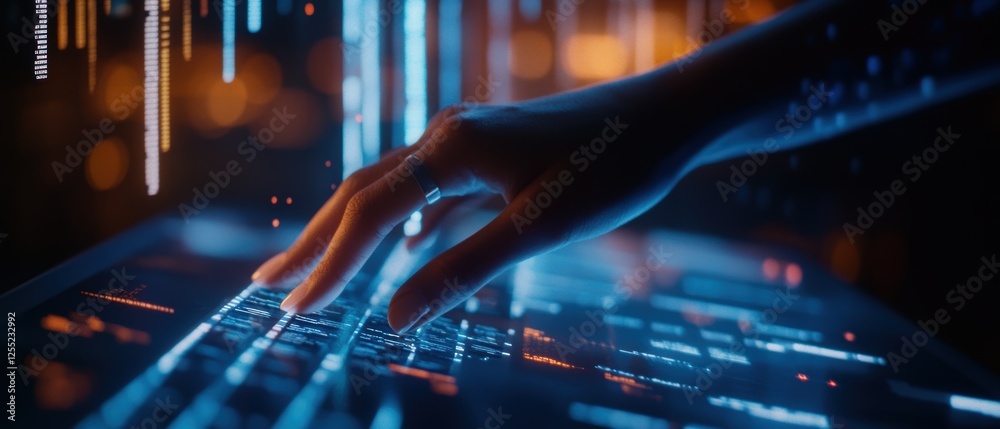 Wall mural digital technology and hands typing on futuristic keyboard with glowing interface, data analysis, vi - Wall murals Wall mural digital technology and hands typing on futuristic keyboard with glowing interface, data analysis, vi - Wall murals